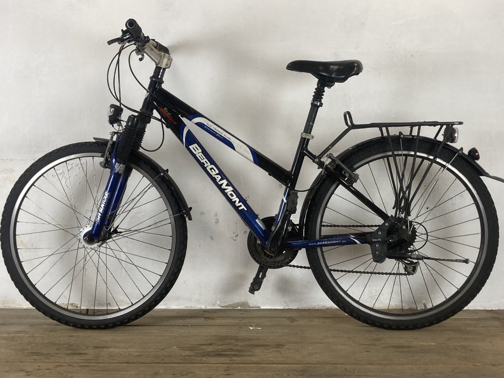 Bergamont Alu Tronic Plus 26-os kerékméretű, alumínium vázas, Shimano Alivio 3 x 8 sebességes váltóval, elől-hátul "V" fékkel, erősített kerekekkel, rugós üléscsővel, teleszkópos első villával, agydinamós világítással szerelt cross trekking kerékpár.