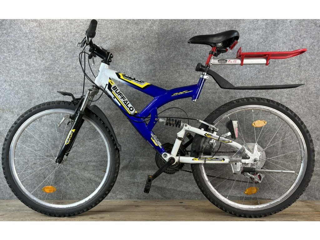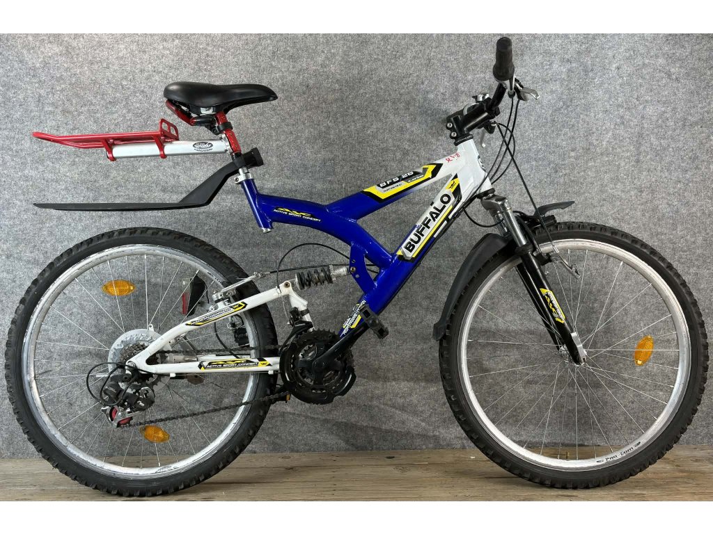 Buffalo BFS 26-os kerékméretű, alumínium vázas, Shimano Tourney 3 x 7 sebességes váltóval, Shimano hajtóművel, elől- hátul "V" fékkel, sárvédővel és csomagtartóval szerelt mountain bike.