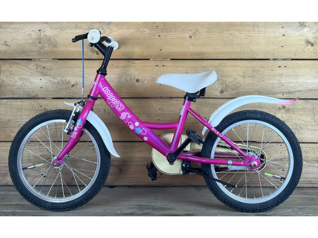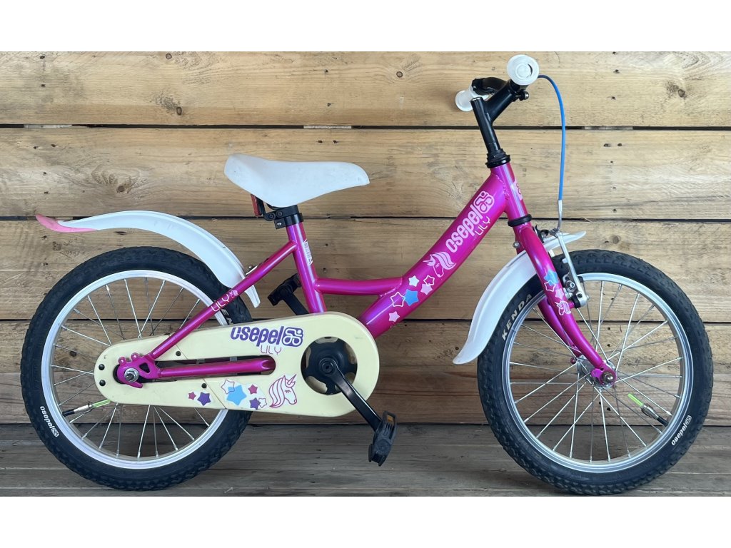 Csepel Lily 16-os kerékméretű, alumínium vázas, egysebességes, kontrafékkel, elől-hátul sárvédővel szerelt gyerekkerékpár.