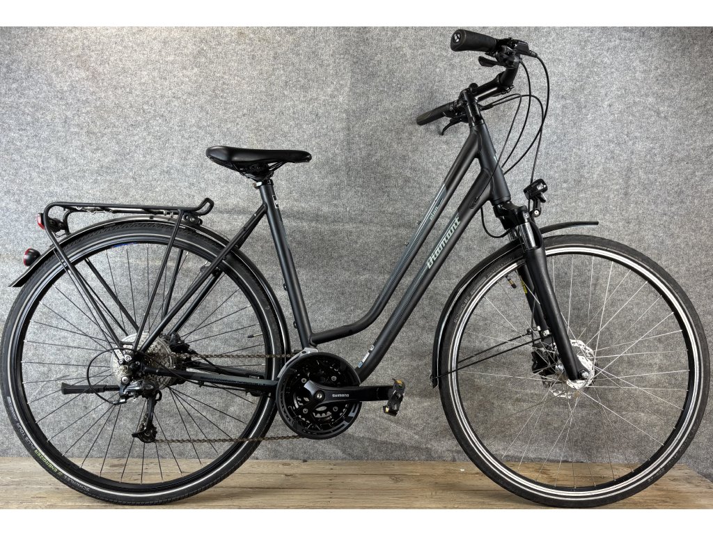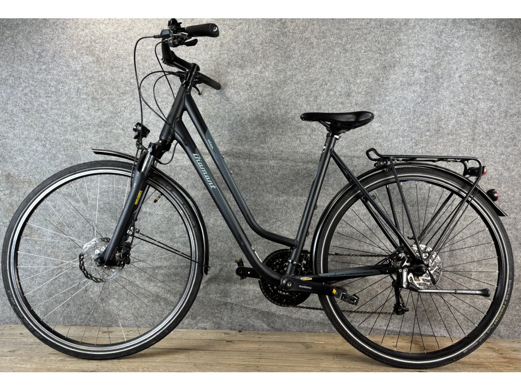 Diamant Elan 28-as kerékméretű, alumínium vázas, Shimano Deore 3 x 9 sebességes váltóval, elől- hátul Shimano hidraulikus tárcsafékkel, agydinamós világítással, sárvédővel, csomagtartóval szerelt, megkímélt állapotú városi kerékpár.