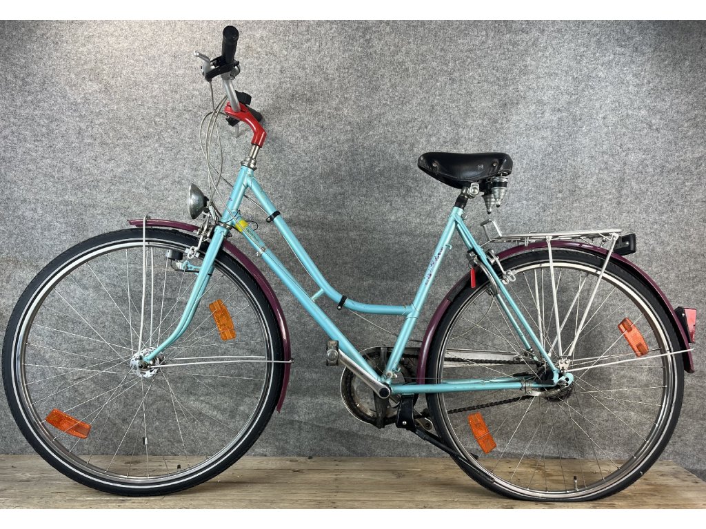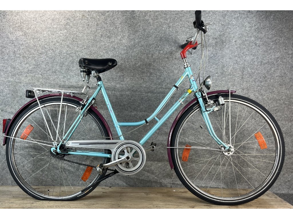 Epple Blue City 28-as kerékméretű, acélvázas, Sachs Torpedo 5 sebességes agyváltóval, elől- hátul patkófékkel, hátul kontrafékkel is, dinamós világítással, vázra szerelt kerékzárral, sárvédővel, csomagtartóval szerelt city kerékpár.