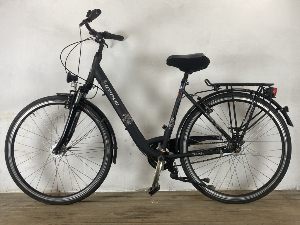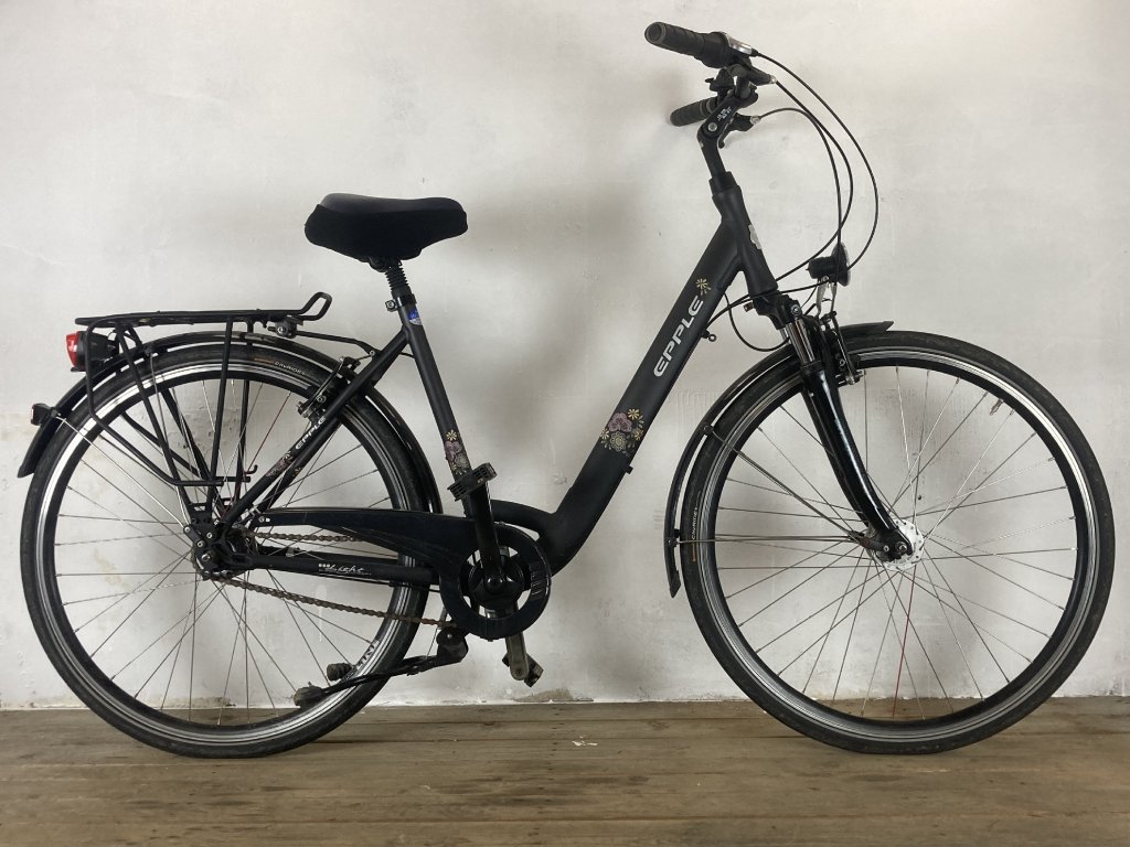 Epple Roses 28-as kerékméretű, alumínium vázas, Shimano Nexus 7 sebességes agyváltóval, elől hátul "V" fékkel, és hátul kontrafékkel, agydinamós világítással, állítható kormánybefogóval. rugós üléscsővel, sárvédővel, csomagtartóval szerelt city kerékpár