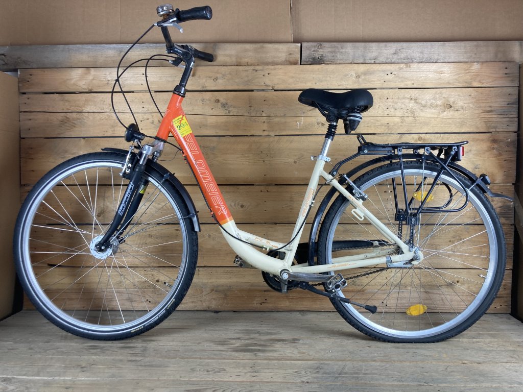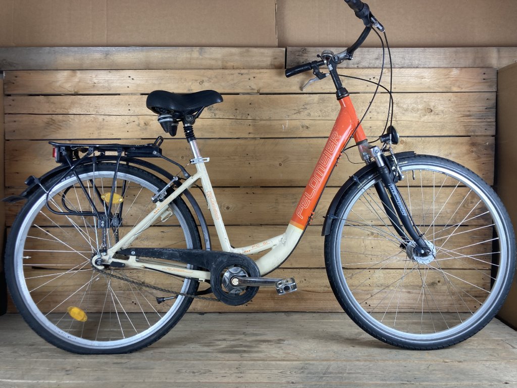 Feldmeier FC 51 28-as kerékméretű, alumínium vázas, Shimano 3 sebességes agyváltóval, elől- hátul "V" fékkel, hátul kontrafékkel is, agydinamós világítással, rugós üléscsővel, állítható kormánybefogóval, sárvédővel, csomagtartóval, teleszkópos első villával szerelt city kerékpár.