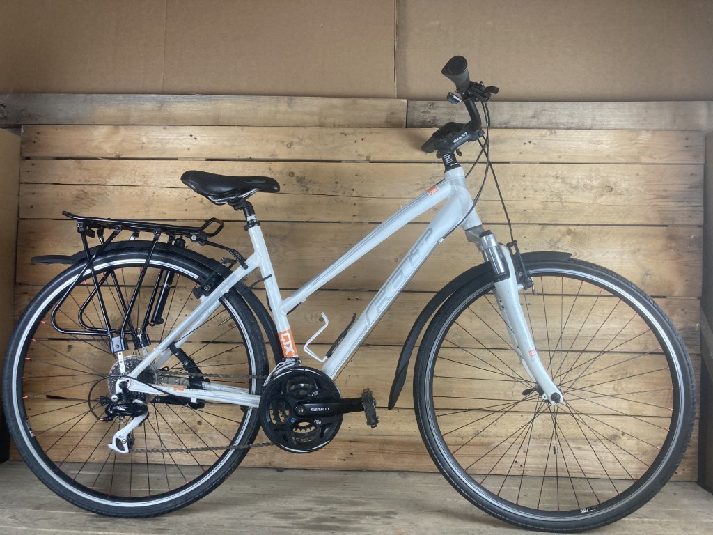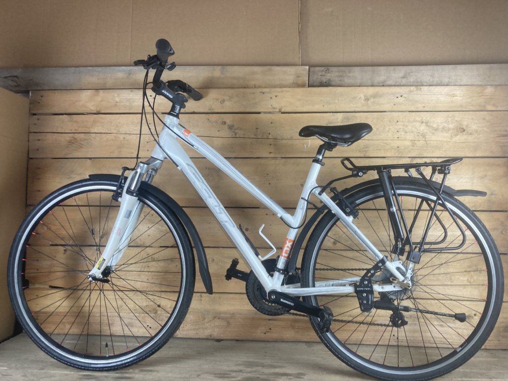 FELT QX 28-as kerékméretű, alumínium vázas, Shimano Alivio 3 x 8 sebességes váltóval, elől-hátul "V" fékkel, erősített kerekekkel, teleszkópos első villával, Shimano hajtóművel, elől-hátul sárvédővel és csomagtartóval szerelt trekking kerékpár.