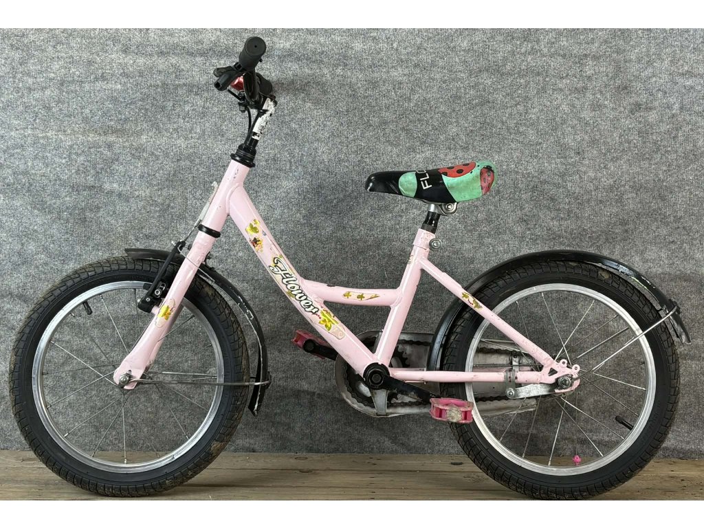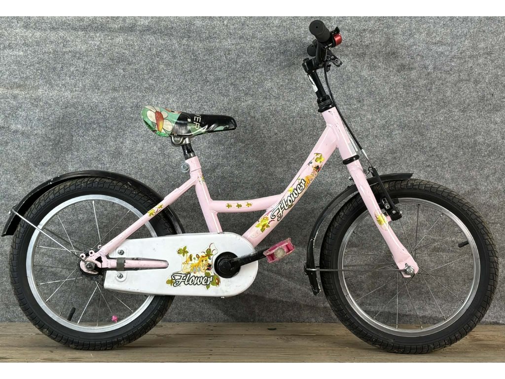 Flower 16-os kerékméretű, alumínium vázas, egysebességes, kontrafékkel, elől-hátul sárvédővel szerelt gyerekkerékpár.