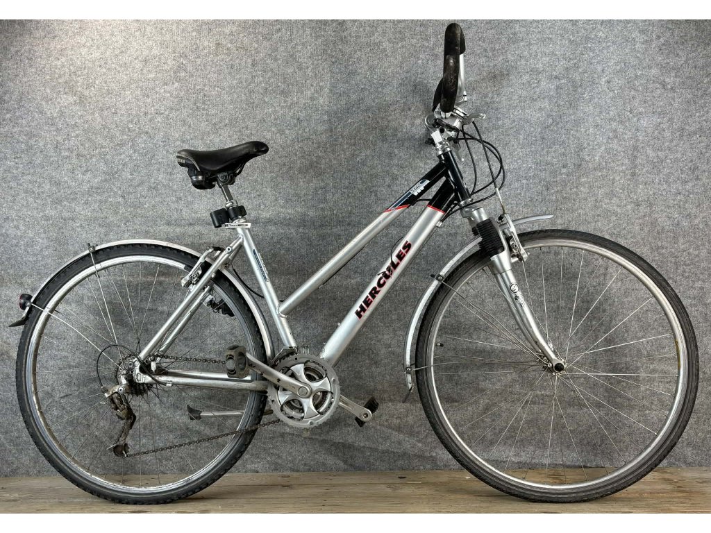 Hercules Nepal 28-as kerékméretű, alumínium vázas, Exage 3 x 7 sebességes váltóval, elől-hátul "V" fékkel, sárvédővel szerelt trekking kerékpár.