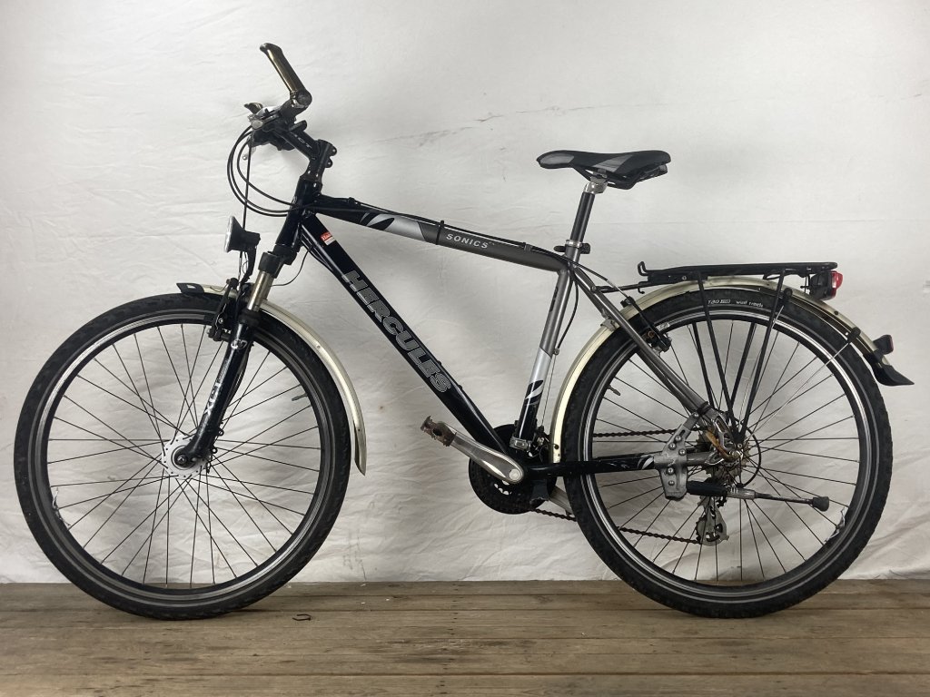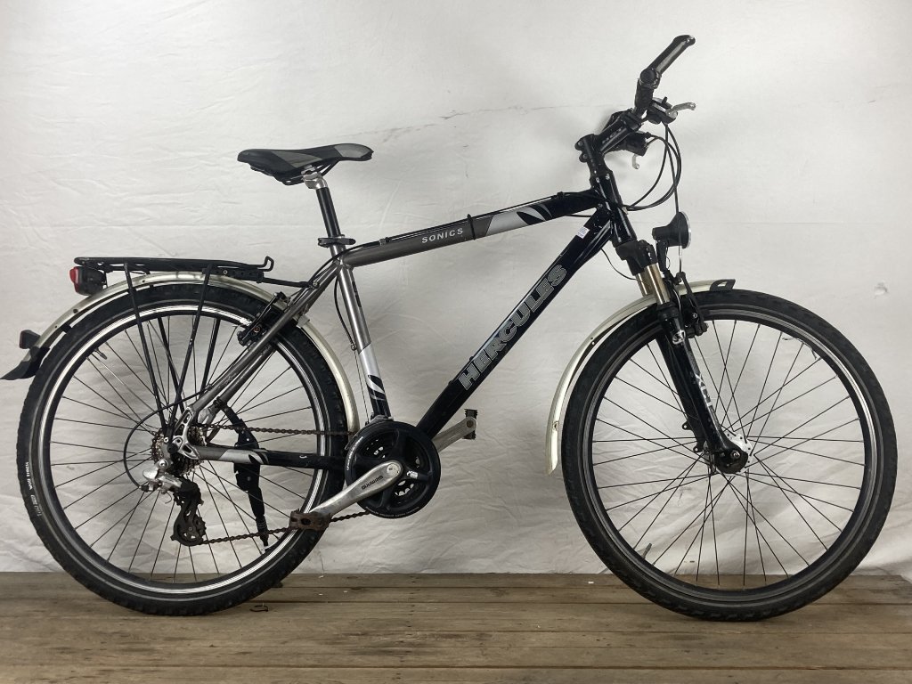 Hercules Sonics 26-os kerékméretű, alumínium vázas, Shimano Acera 3 x 7 sebességes váltóval, elől-hátul "V"fékkel, teleszkópos első villával, Shimanó hajtóművel, agydinamós világítással, sárvédővel, csomagtartóval szerelt trekking kerékpár.