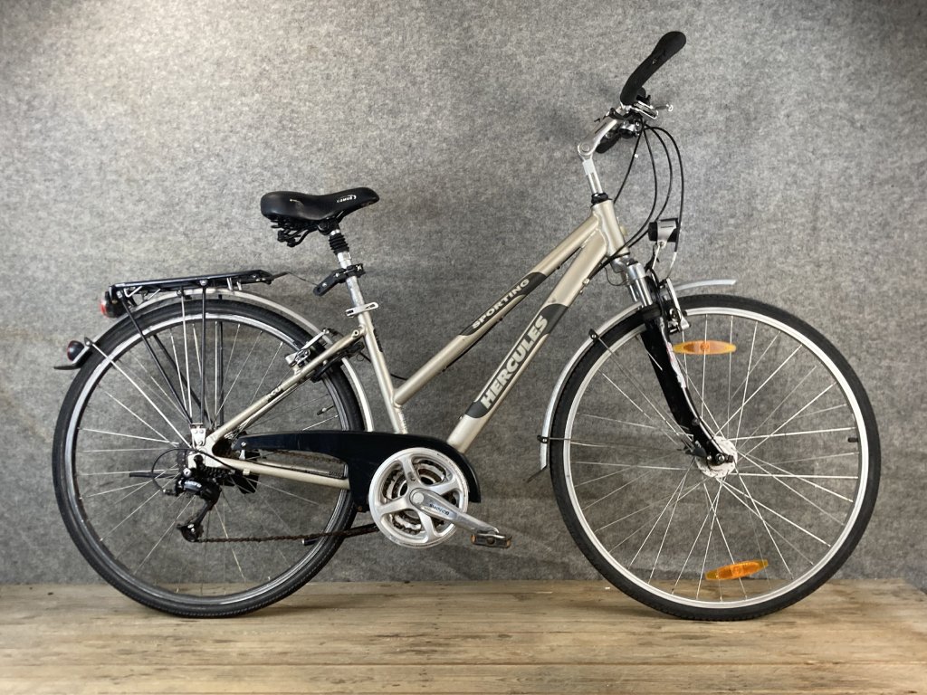 Hercules Sporting 28-as kerékméretű, alumínium vázas, Shimano Deore 3 x 8 sebességes váltóval, elől-hátul "V" fékkel, erősített kerekekkel, rugós üléscsővel, állítható kormánybefogóval, teleszkópos első villával, agydinamós világítással szerelt trekking kerékpár.
