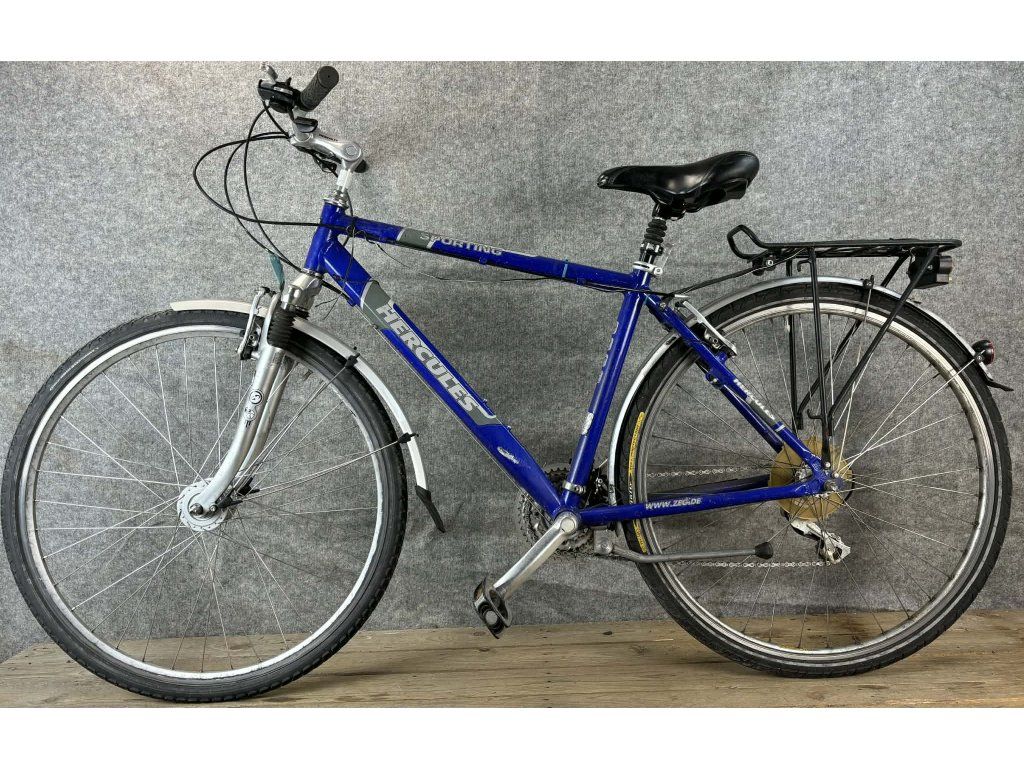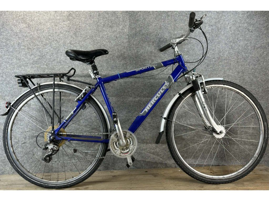 Hercules Sporting 28-as kerékméretű, alumínium vázas, Shimano Acera 3 x 7 sebességes váltóval, elől- hátul "V" fékkel, rugós üléscsővel, dinamós világítással, sárvédővel, csomagtartóval szerelt trekking kerékpár.
