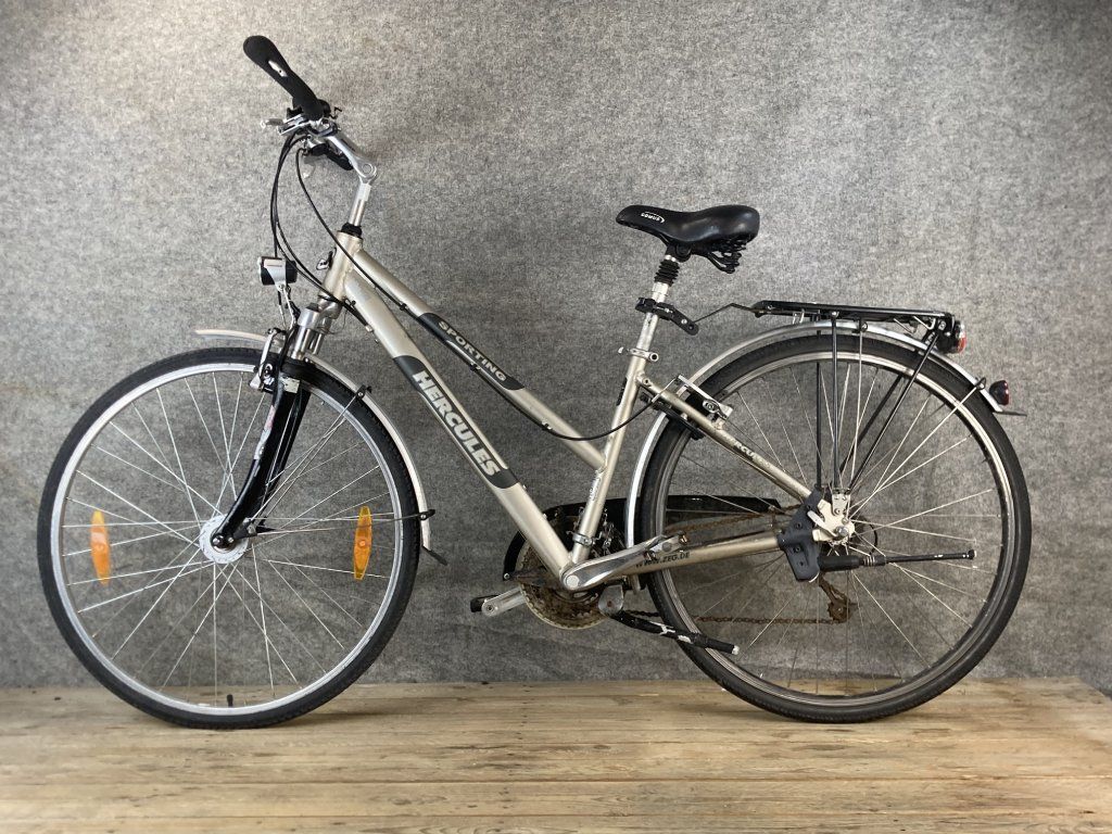 Hercules Sporting 28-as kerékméretű, alumínium vázas, Shimano Deore 3 x 8 sebességes váltóval, elől-hátul "V" fékkel, erősített kerekekkel, rugós üléscsővel, állítható kormánybefogóval, teleszkópos első villával, agydinamós világítással szerelt trekking kerékpár.