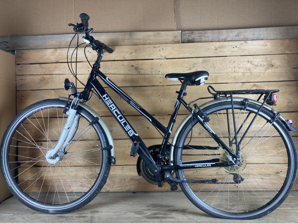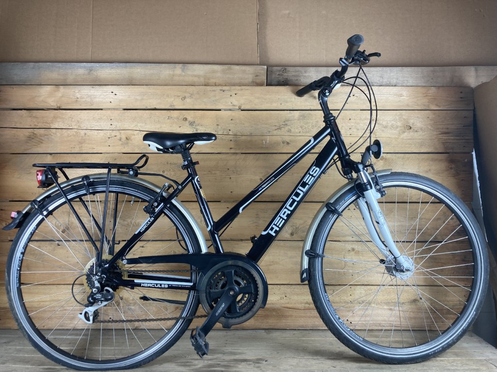 Hercules Trekking A24 28-os kerékméretű, alumínium vázas, Shimano Alivio 3 x 8 sebességes váltóval, elől hátul "V" fékkel, Shimano hajtóművel, erősített kerekekkel, sárvédővel, csomagtartóval, állítható kormánybefogóval, rugós üléscsővel és agydinamós világítással szerelt kerékpár