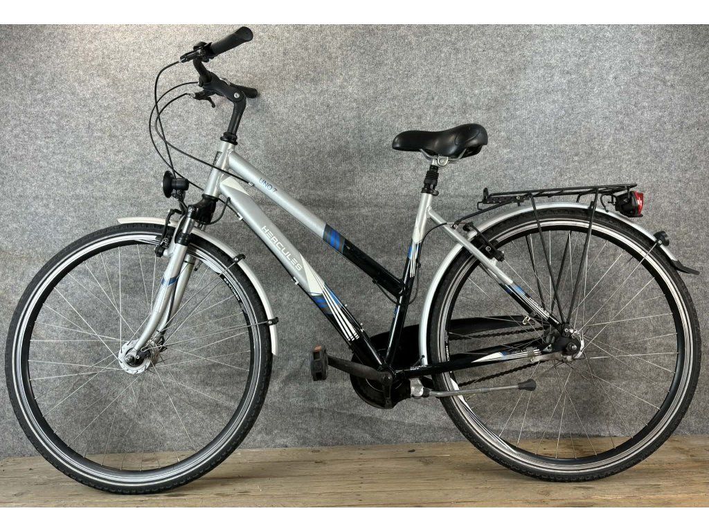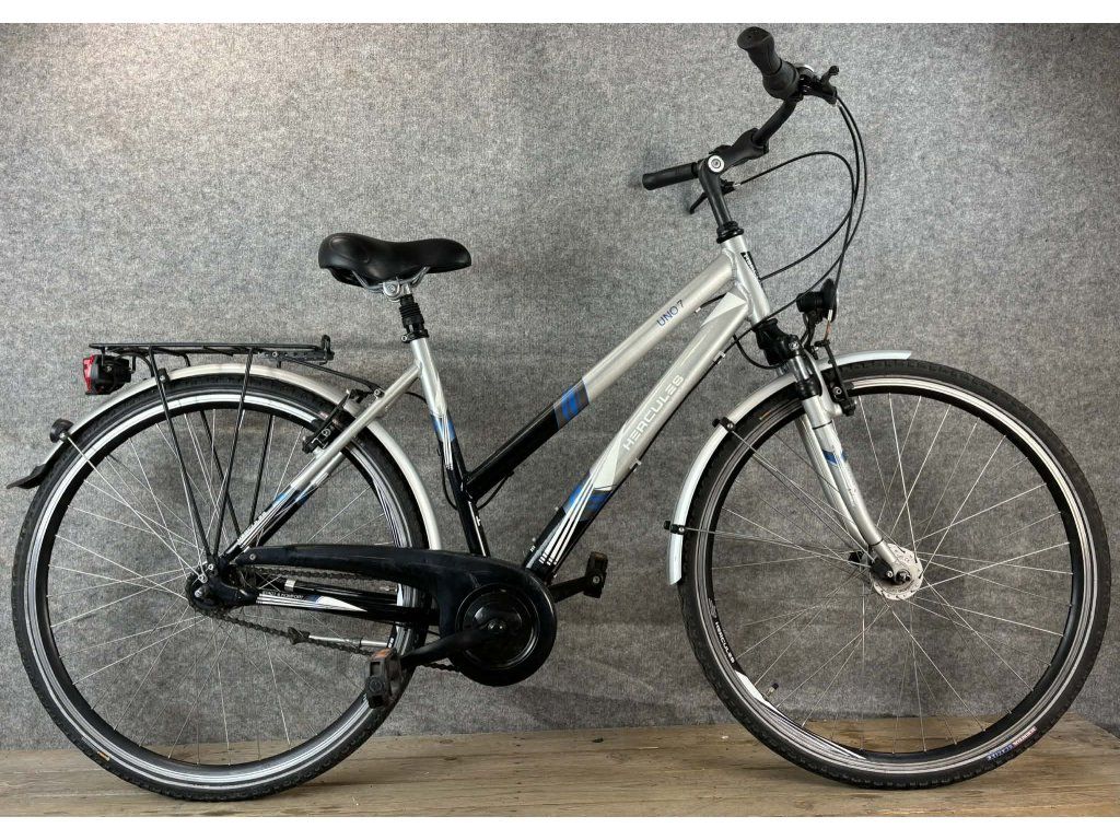Hercules Uno 7 28-as kerékméretű, alumínium vázas, Shimano Nexus 3 x 7 sebességes váltóval, elől hátul "V" fékkel, agydinamós világítással, sárvédővel és csomagtartóval szerelt trekking kerékpár.