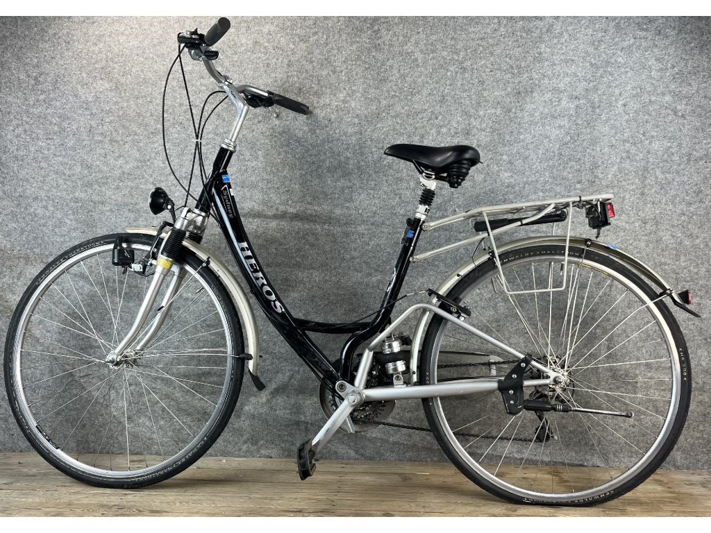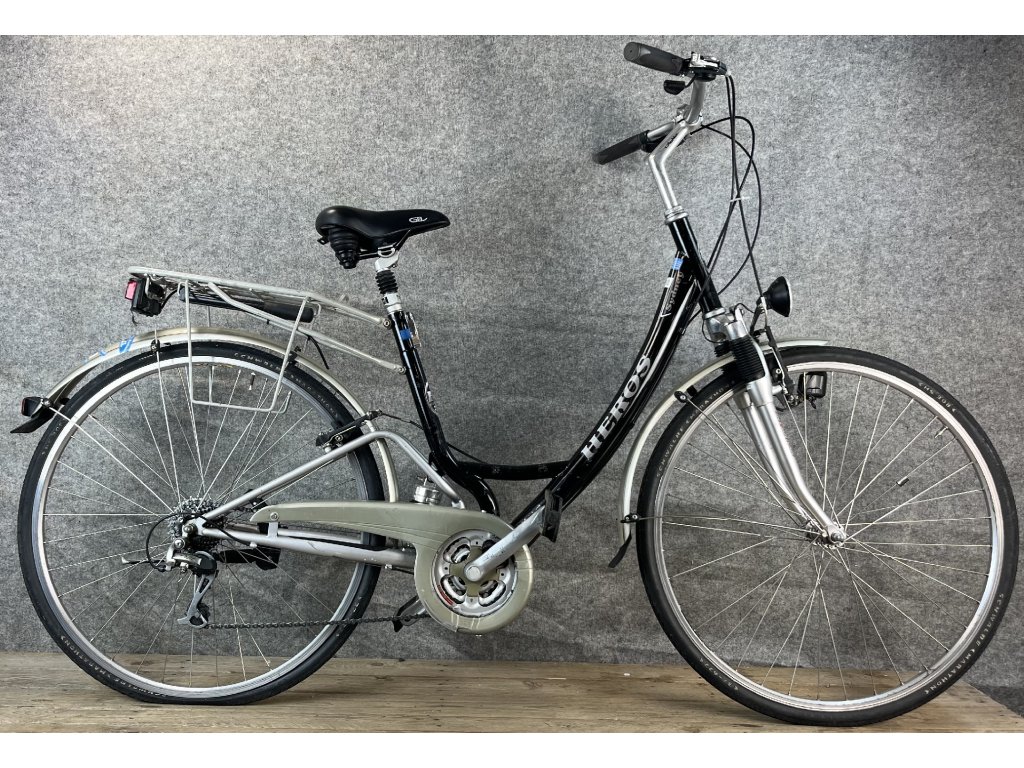 Heros Cydney 28-as kerékméretű, összteleszkópos, alumínium vázas, Shimano Acera 3 x 7 sebességes váltóval, elől hátul "V" fékkel, dinamós világítással, rugós üléscsővel, sárvédővel, csomagtartóval szerelt városi kerékpár