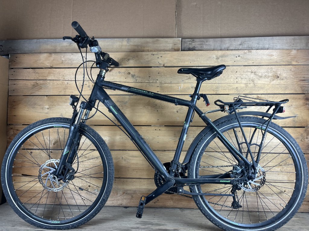 Kalkhoff Moonrider 26-os kerékméretű, alumínium vázas,Shimano Acera 3 x 8 sebességes váltóval, elől-hátul hidraulikus tárcsafékkel, erősített kerekekkel, teleszkópos első villával, Shimano hajtóművel, agydinamós világítással, sárvédővel és csomagtartóval szerelt trekking kerékpár.