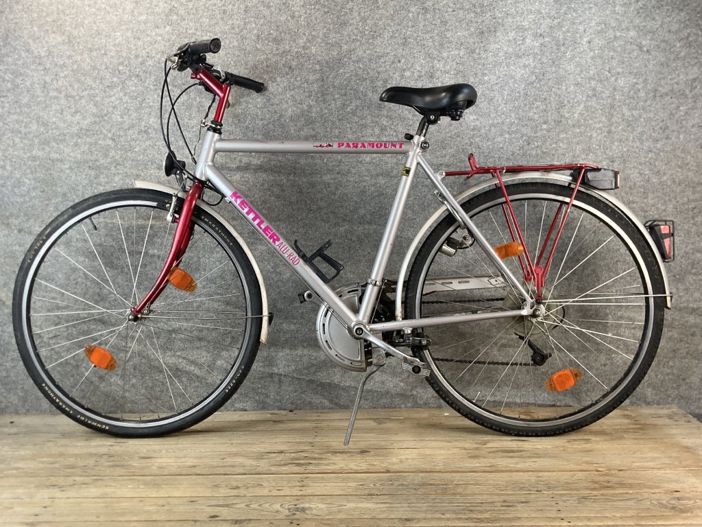 Kettler Alu-Rad Paramount, 28-as kerékméretű, alumínium vázas, Shimano STX 3 x 7 sebességes váltóval, elől-hátul canti fékkel, Shimano Alivio hajtóművel, erősített kerekekkel, sárvédővel, dinamós világítással csomagtartóval szerelt trekking kerékpár.