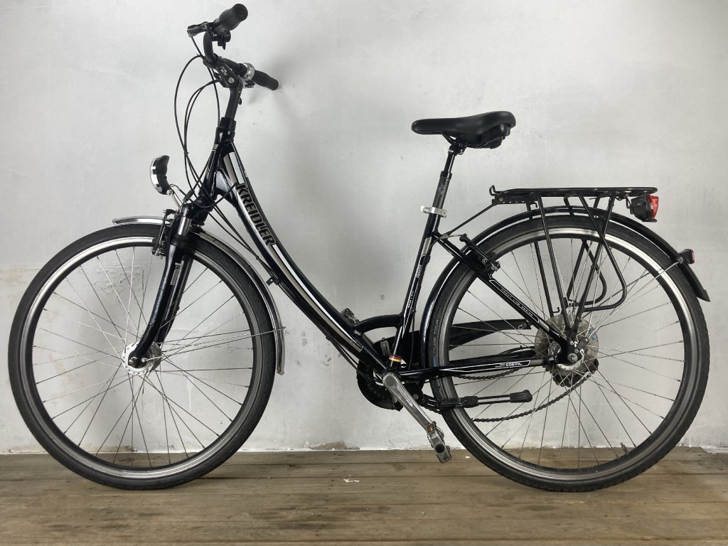 Kreidler Raise 28-as kerékméretű, alumínium vázas, Sram Dual Drive 3 x 8 sebességes, lánc és agyváltóval, elől hátul "V" fékkel, agydinamós világítással, teleszkópos első villával, rugós üléscsővel, sárvédővel, csomagtartóval szerelt városi kerékpár