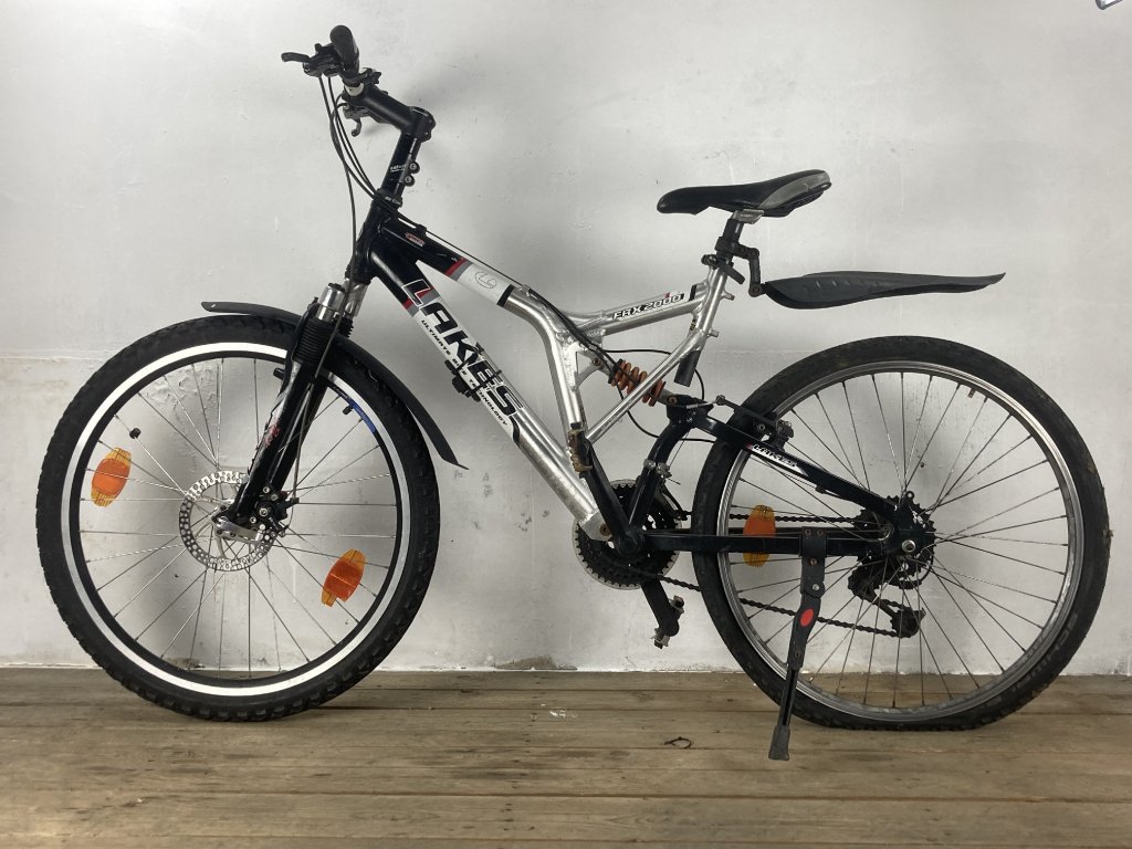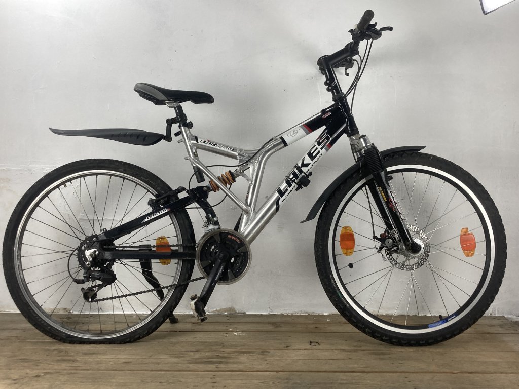 Lakes FRX 2000 26-os kerékméretű, alumínium vázas, összteleszkópos, Shimano LX 3 x 7 sebességes váltóval, elől - hátul "V" fékkel, sárvédővel, magasított kormánnyal szerelt mountain bike.