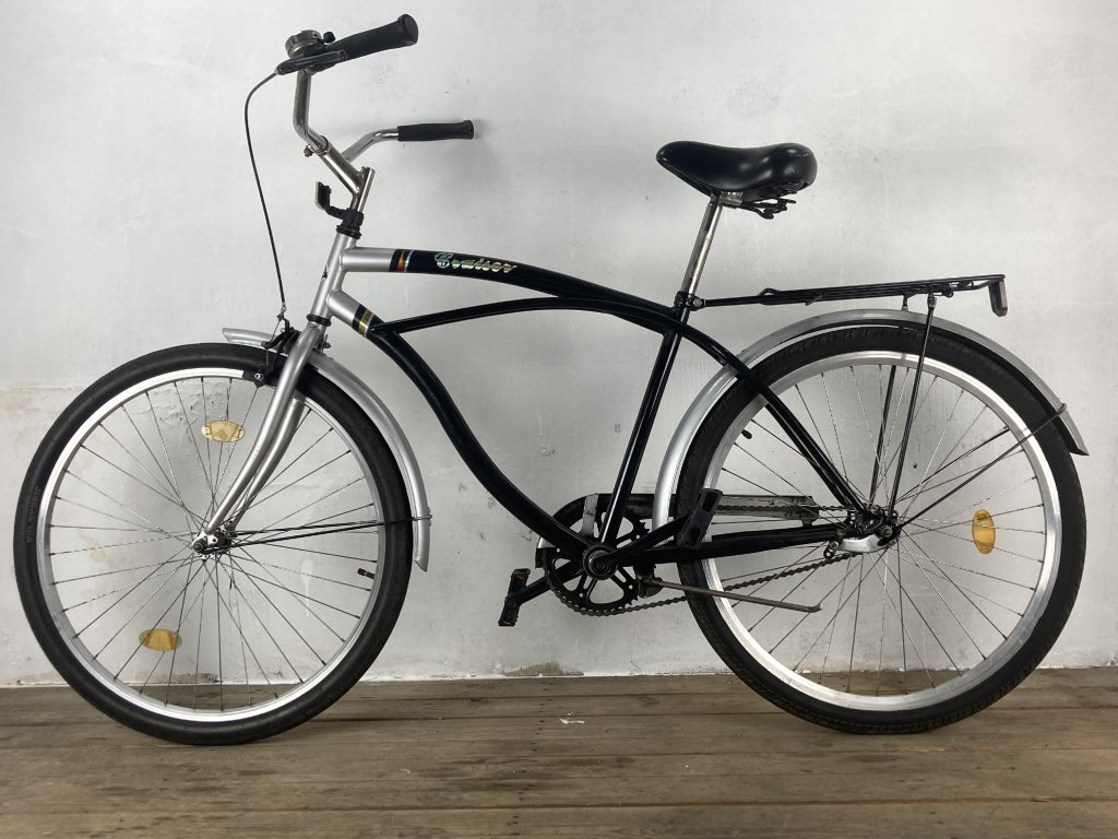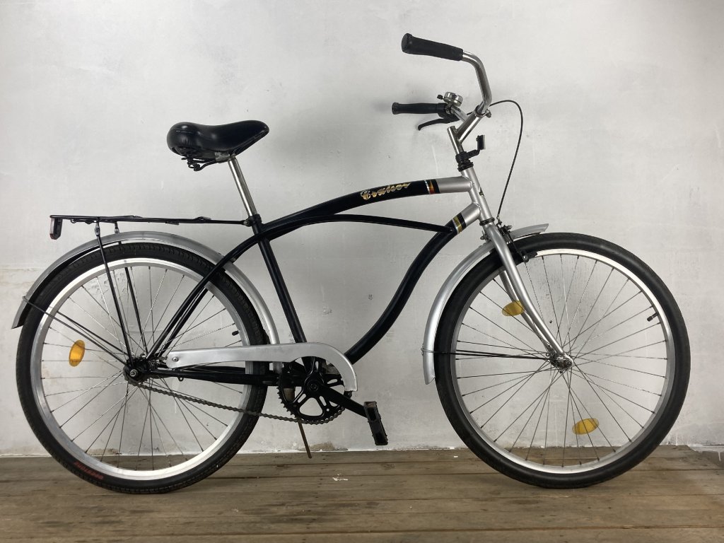 Lofty Cruiser 26-os kerékméretű, acél vázas, egysebességes, kontrafékes, városi kerékpár, sárvédővel, csomagtartóval szerelt.