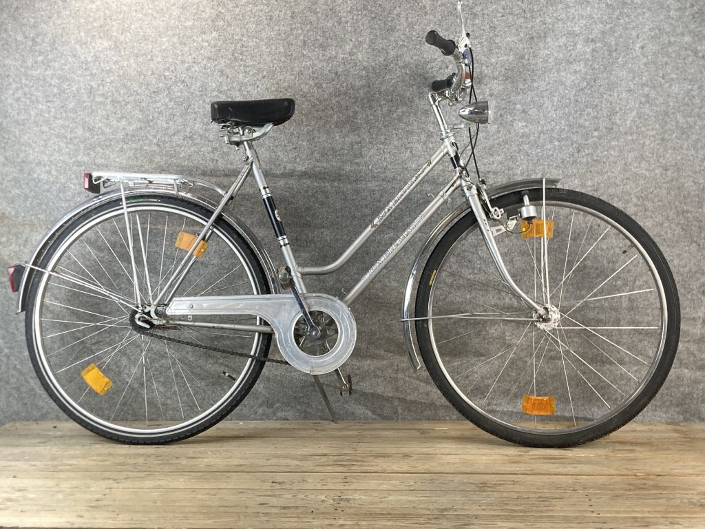 Lux Elegant 28-as kerékméretű, acélvázas, Sachs 3 sebességes agyváltóval, elől patkófékkel, hátul kontrafékkel, dinamós világítással, sárvédővel, csomagtartóval, szerelt városi kerékpár.