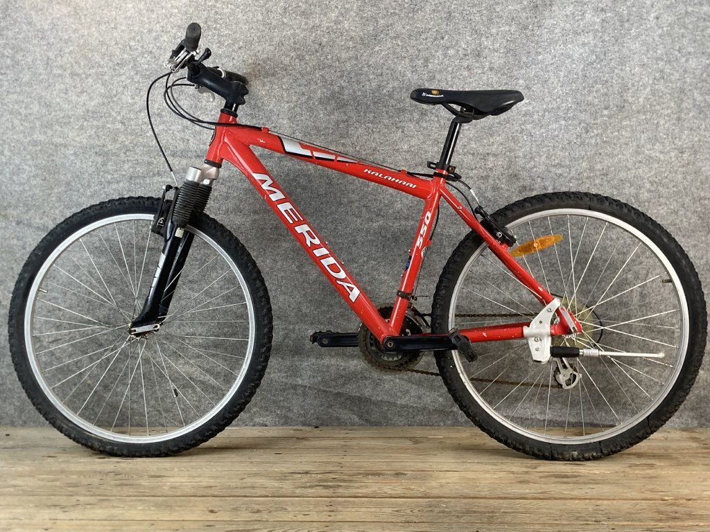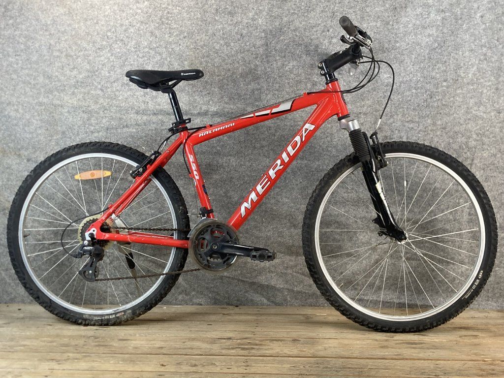 Merida Kalahari 550 26-os kerékméretű, alumínium vázas, Shimano Altus 3 x 7 sebességes váltóval, elől- hátul "V" fékkel, teleszkópos első villával szerelt szerelt mountain bike.