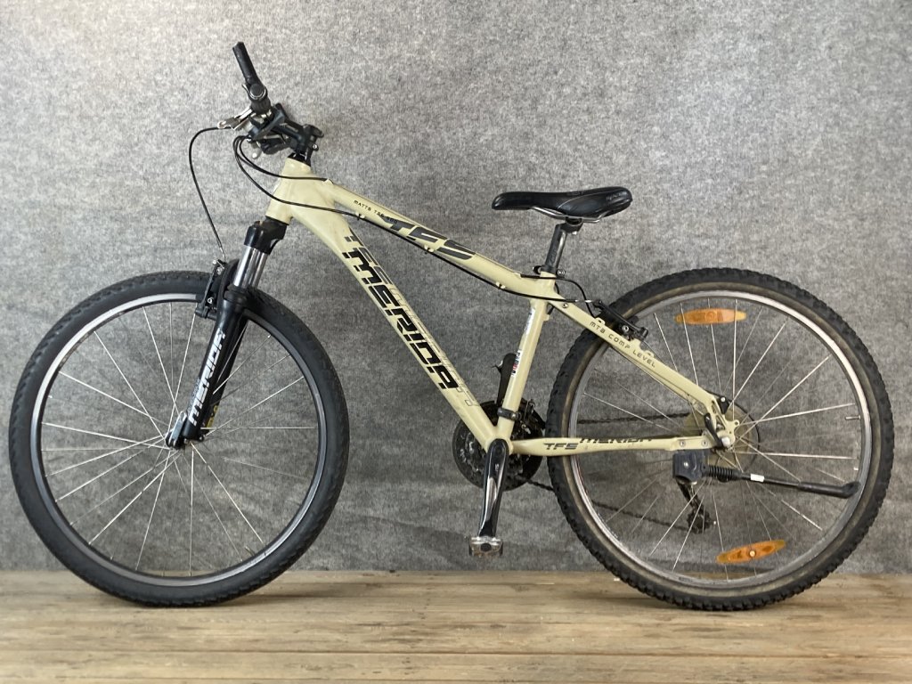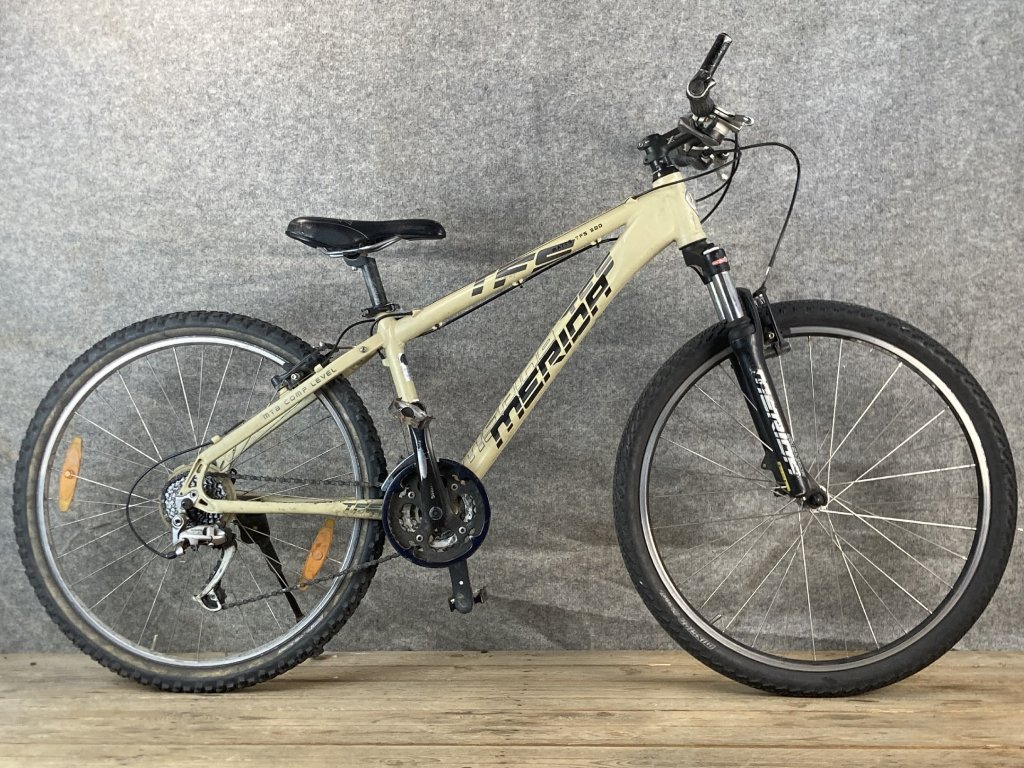 Merida TFS 500, 26-os kerékméretű, alumínium vázas, Shimano Deore XT 3 x 8 sebességes váltóval, Shimano Alivio fékváltókarokkal, elől-hátul X- Mission "V"fékkel, lockolható teleszkópos első villával, Shimanó hajtóművel szerelt mountain bike kerékpár.