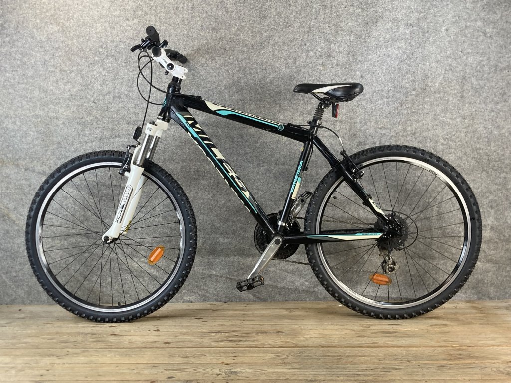 Miles Vanessa 26-os kerékméretű, alumínium vázas, Shimano Alivio 3 x 8 sebességes váltóval, elől- hátul "V" fékkel, teleszkópos első villával, rugós üléscsővel szerelt mountain bike.