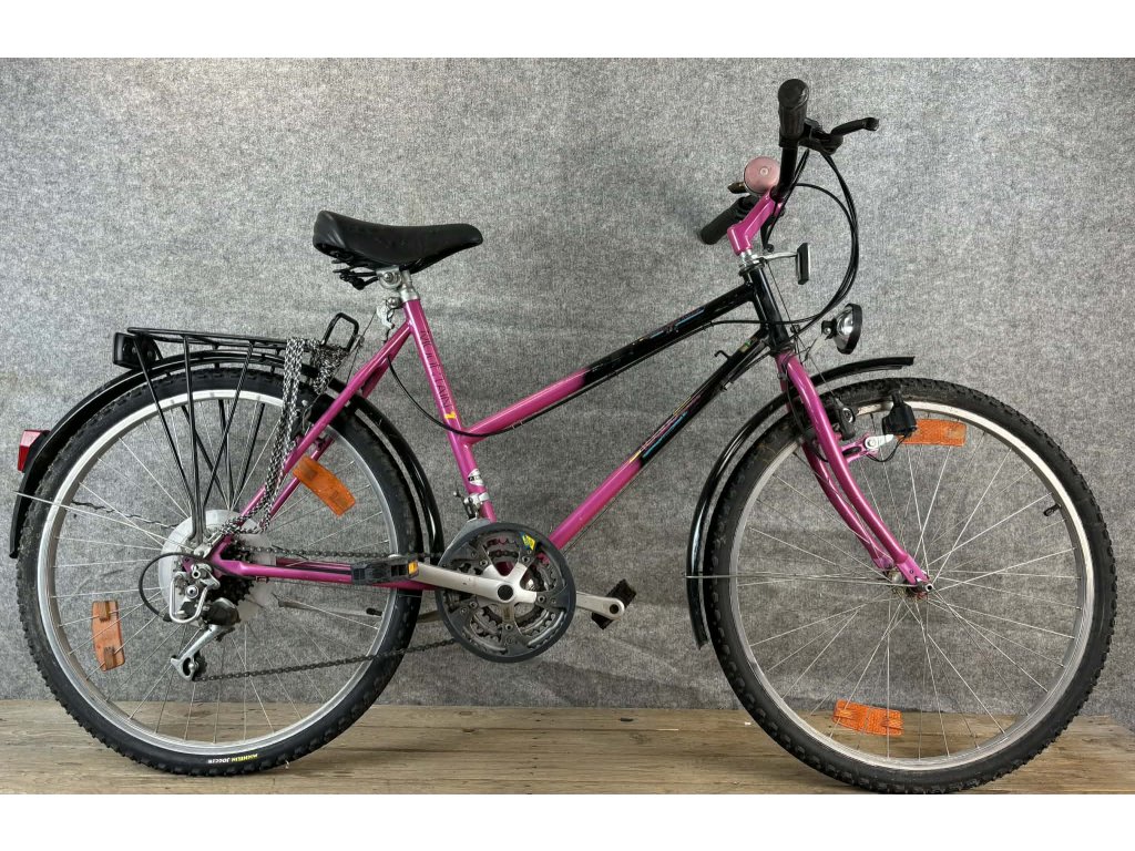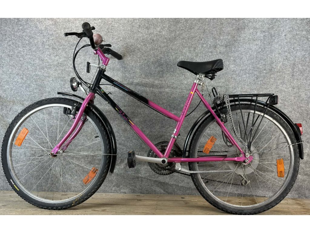 Mountain 26-os kerékméretű, acél vázas, Exage Coutntry 3 x 7 sebességet váltóval, cantifékkel, dinamós világítással, sárvédővel, csomagtartóval szerelt szerelt city kerékpár.