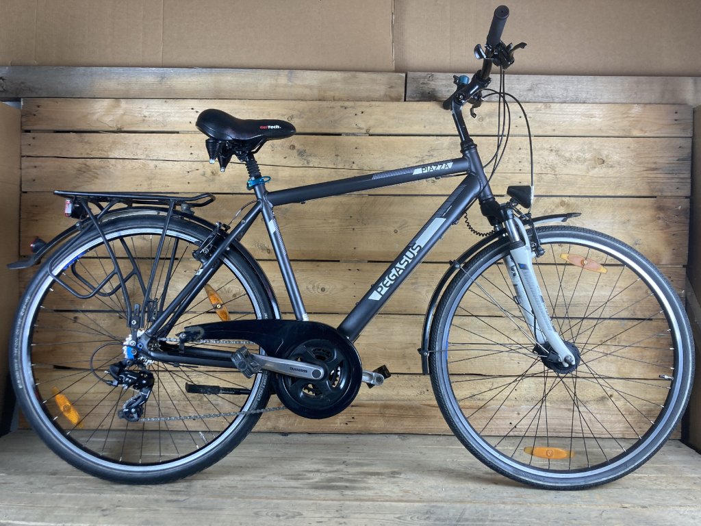 Pegasus Piazza 28-as kerékméretű, alumínium vázas, Shimano 3 x 7 sebességes váltóval, elől- hátul "V" fékkel, agydinamós világítással, sárvédővel, csomagtartóval szerelt trekking kerékpár.