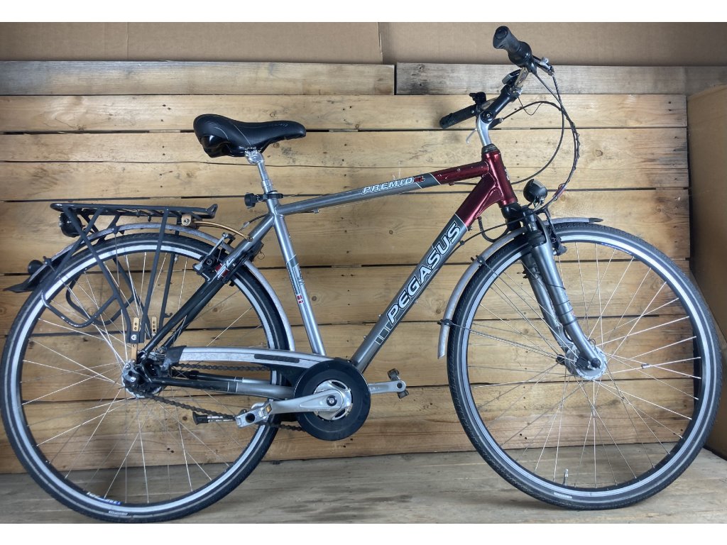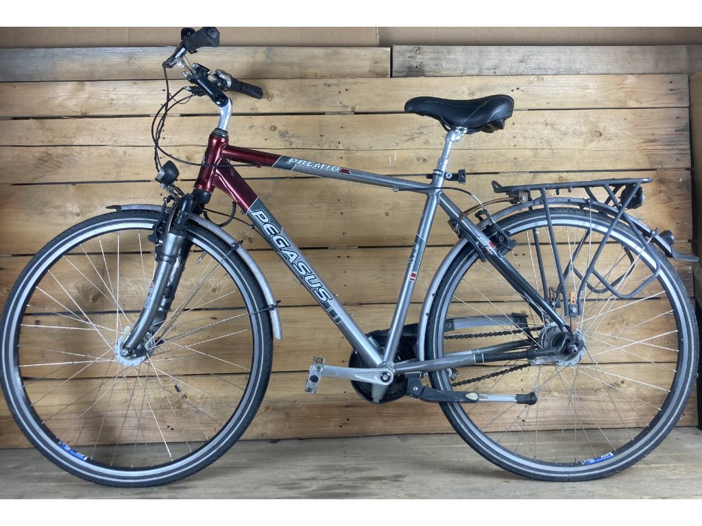 Pegasus Premito SL 28-as kerékméretű, alumínium vázas, 8 sebességes agyváltóval, kontra fékkel, agydinamós világítással, teleszkópos első villával, elől-hátul sárvédővel és csomagtartóval szerelt trekking kerékpár.