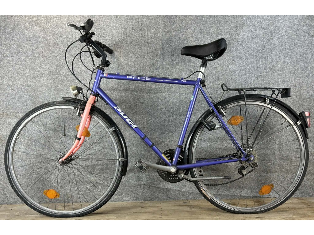 Puch Acera 28-as kerékméretű, acél vázas, Shimano Altus 3 x 7 sebességes váltóval, elől hátul cantifékkel, dinamós világítással, rugós üléscsővel, csomagtartóval, sárvédővel szerelt city kerékpár.