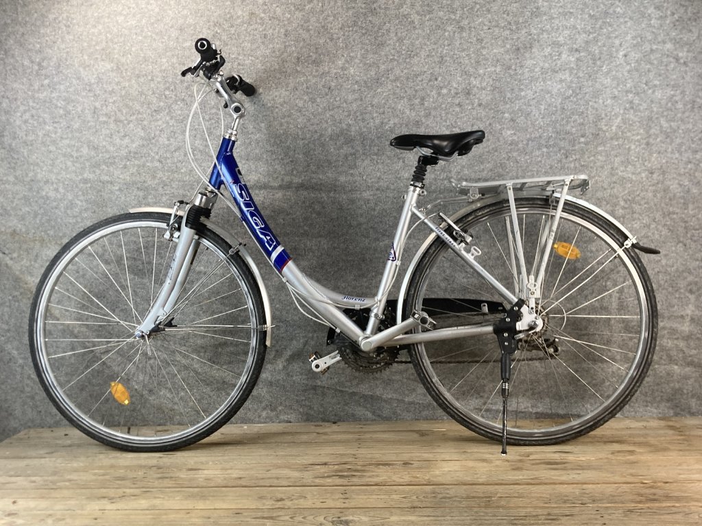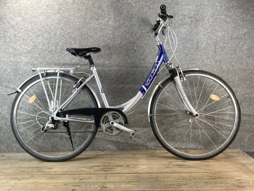 Siga Florenz 28-as kerékméretű, alumínium vázas, Shimano Alivio 3 x 7 sebességes váltóval, elől hátul Shimano "V" fékkel, állítható kormánybefogóval, rugós üléscsővel, elemes lámpákkal, sárvédővel és csomagtartóval szerelt city kerékpár.