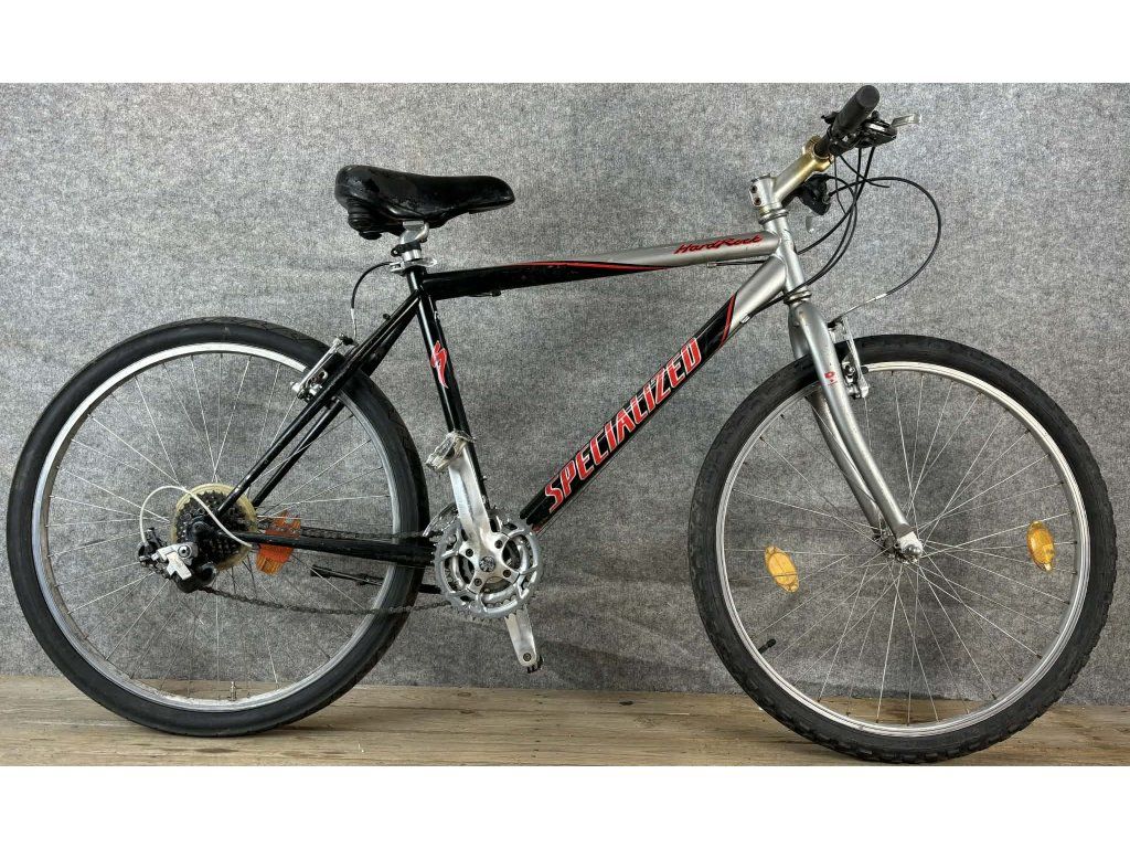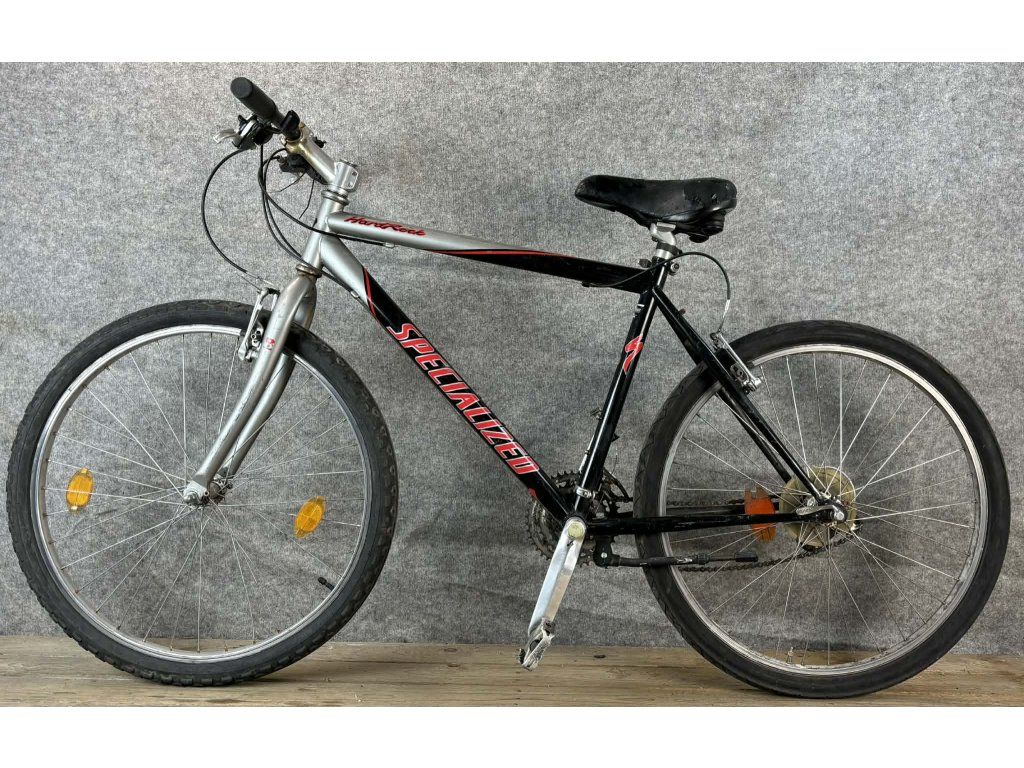 Specialized 26-os kerékméretű, acél vázas, Shimano 3 x 8 sebességes váltóval, elől hátul "V" fékkel szerelt mountain bike.