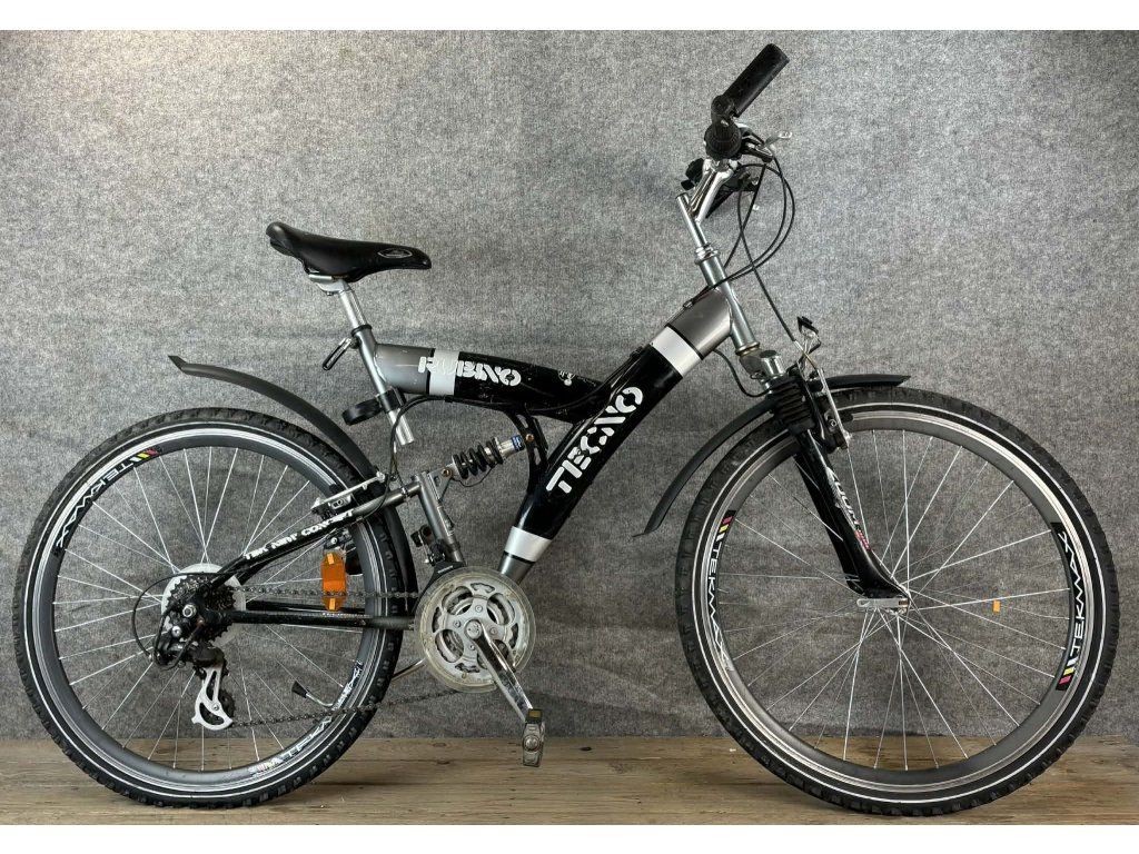 Tecno Rubino 26-os kerékméretű, összteleszkópos, alumínium vázas, Shimano Acera 3 x 7 sebességes váltóval, Shimano hajtóművel, elől- hátul "V" fékkel, erősített kerekekkel és sárvésdővel szerelt mountain bike.