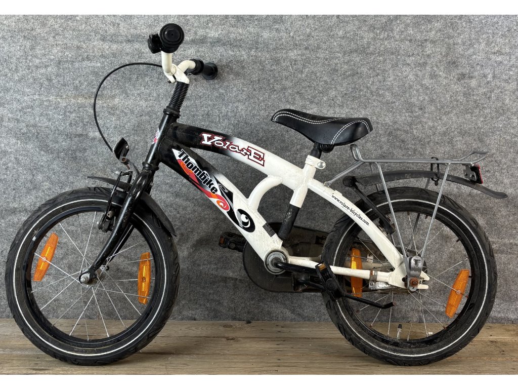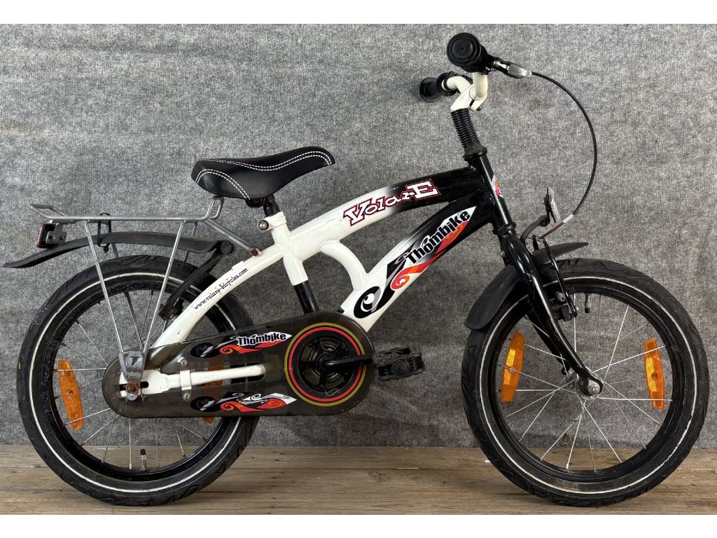 Thombike Volare 16"-os kerékméretű, acél vázas, egysebességes, kontrafékkel, sárvédővel és csomagtartóval szerelt gyerekkerékpár.