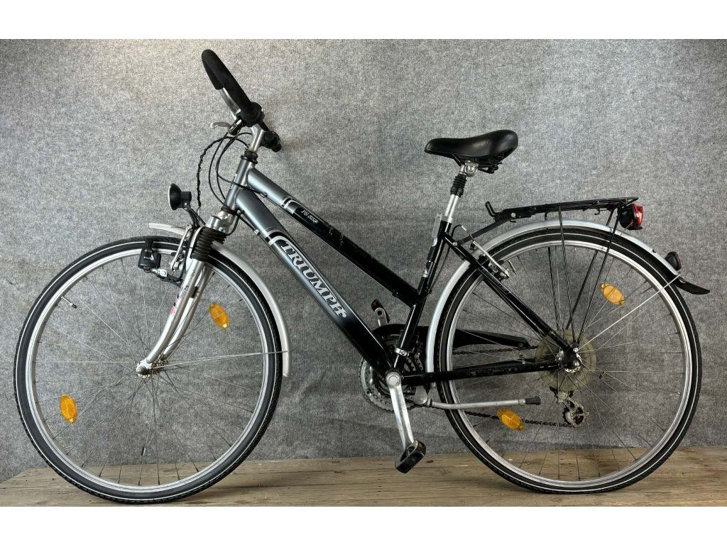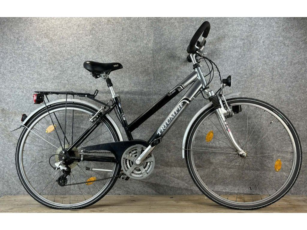 Triumph PS333 28-as kerékméretű, alumínium vázas, Shimano Acera 3 x 7 sebességes váltóval, "V" fékkel, dinamós világítással, rugós üléscsővel, sárvédővel és csomagtartóval szerelt cross trekking kerékpár.