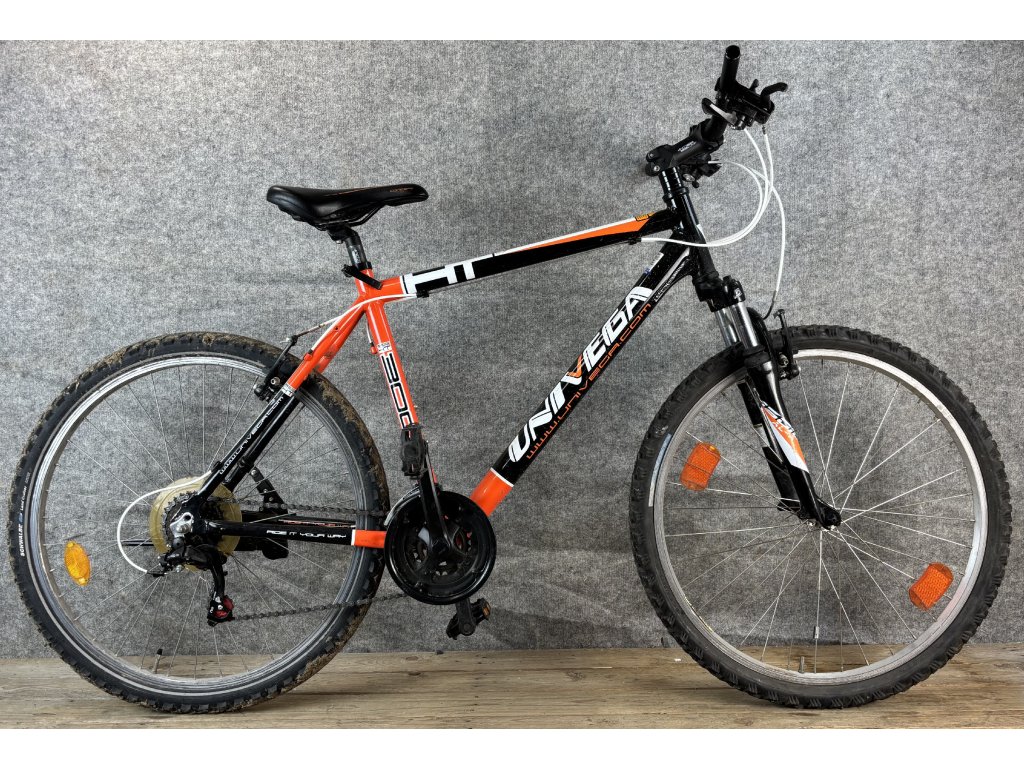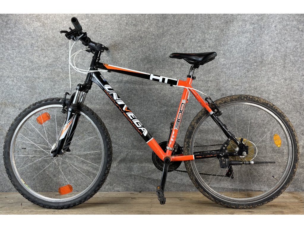 Univega HT300 26-os kerékméretű, alumínium vázas, Shimano Tourney 3 x 7 sebességes váltóval, elől- hátul "V" fékkel, teleszkópos első villával sárvédővel szerelt mountain bike.