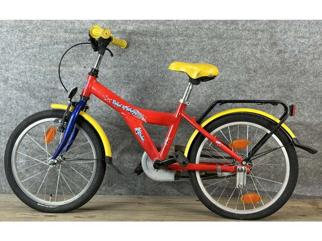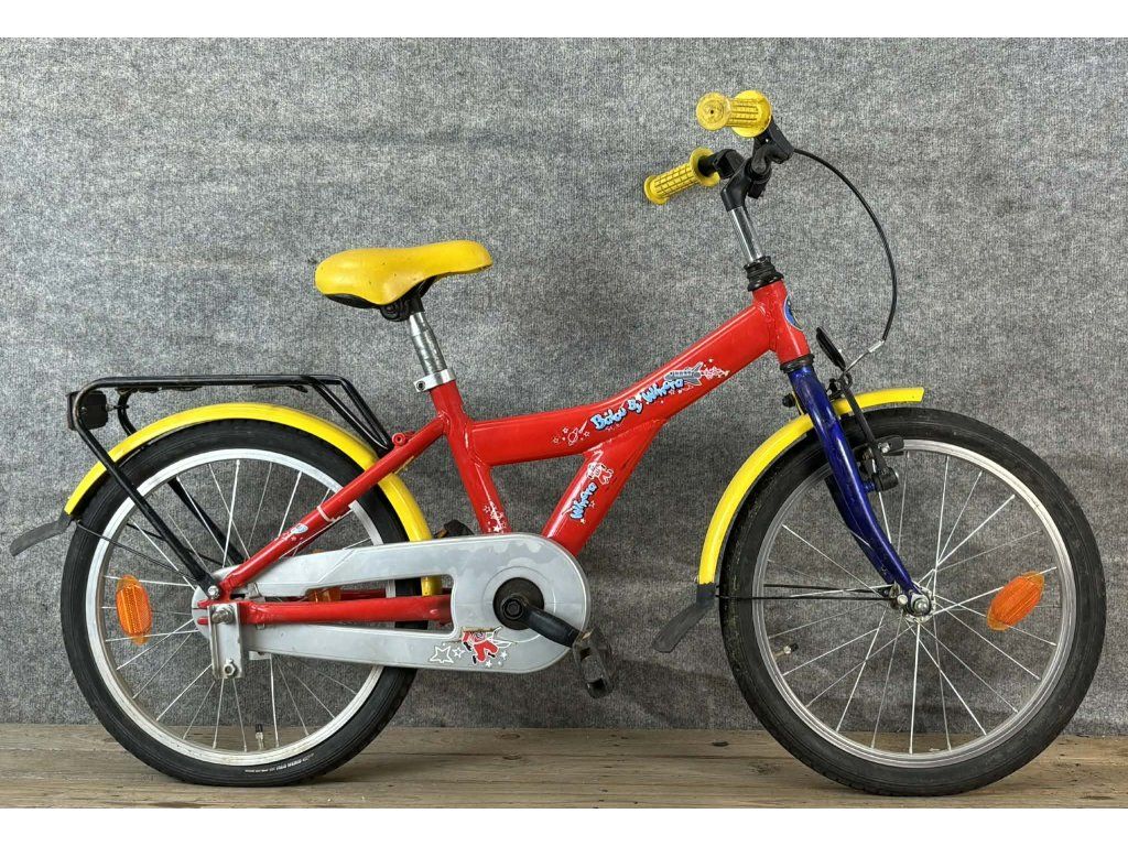 Winora Balou 18-as kerékméretű, alumínium vázas, egysebességes, elől patkófékkel, hátul kontrafékkel, sárvédővel és csomagtartóval szerelt gyerekkerékpár.