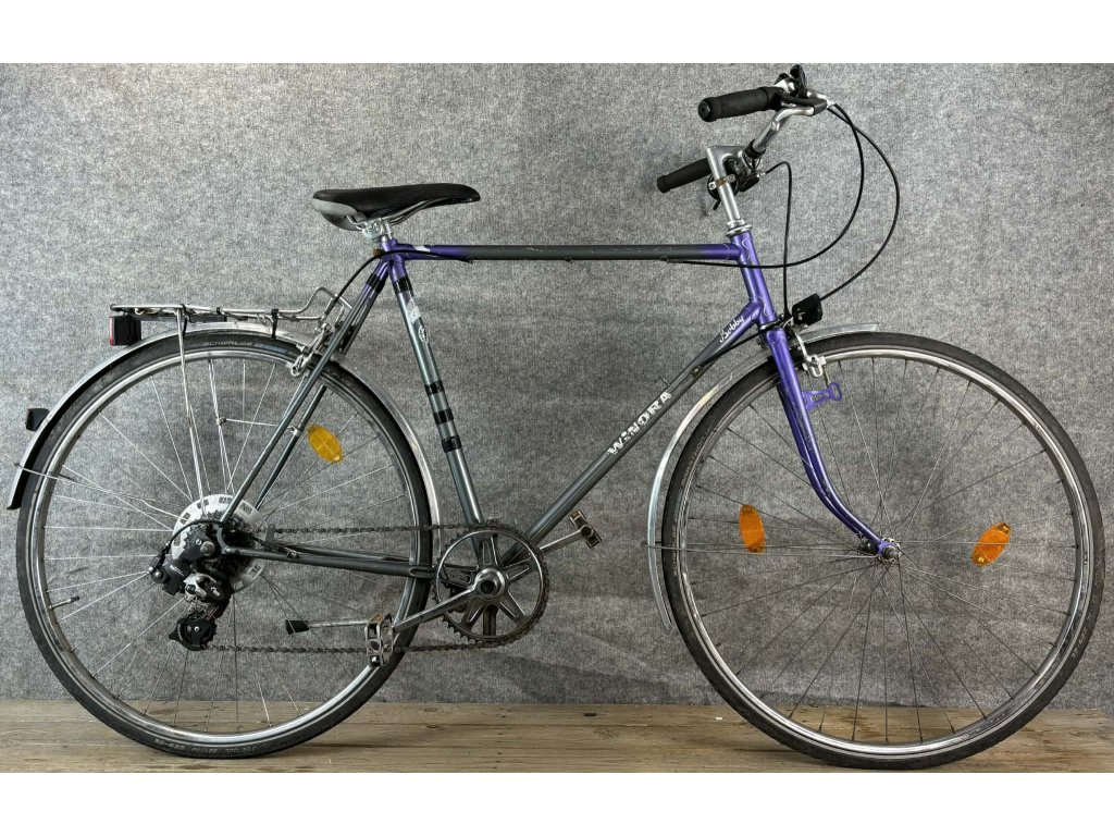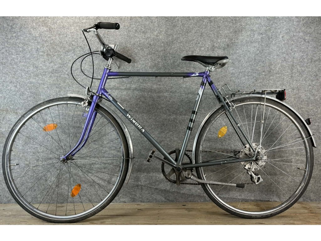 Winora Bubby 28-as kerékméretű, acél vázas, Shimano Tourney 6 sebességes váltóval, elől-hátul patkófékkel, Shimano hajtóművel, elemes világítással, csomagtartóval és sárvédővel szerelt city kerékpár.