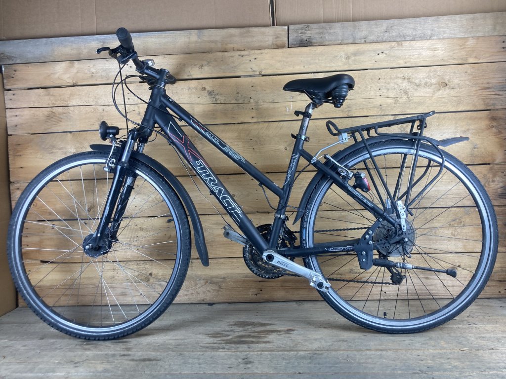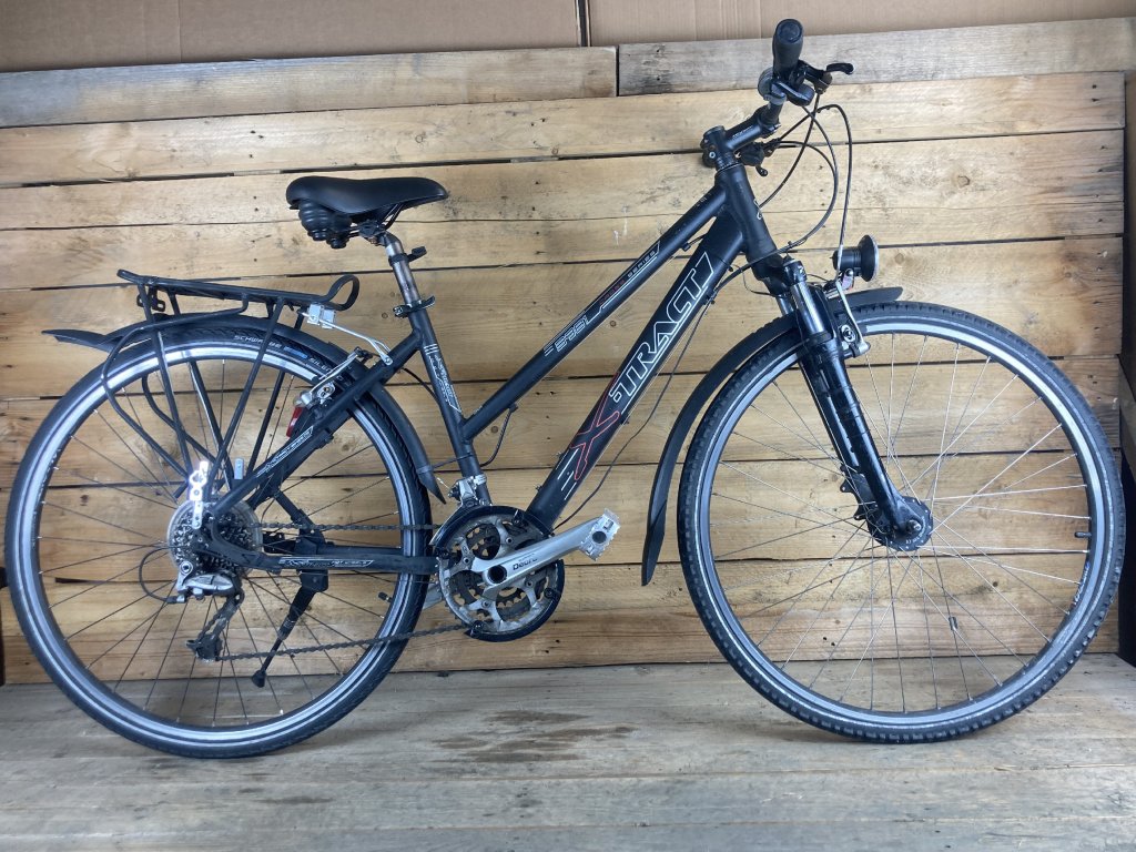 X-tract 3981 28" kerékméretű, alumínium vázas, Shimano Deore LX 3 x 9 sebességes váltóval, elől-hátul"V" fékkel, Shimano Deore integrált hajtóművel, lockolható első teleszkóppal, erősített kerekekkel, agydinamós világítással szerelt trekking kerékpár